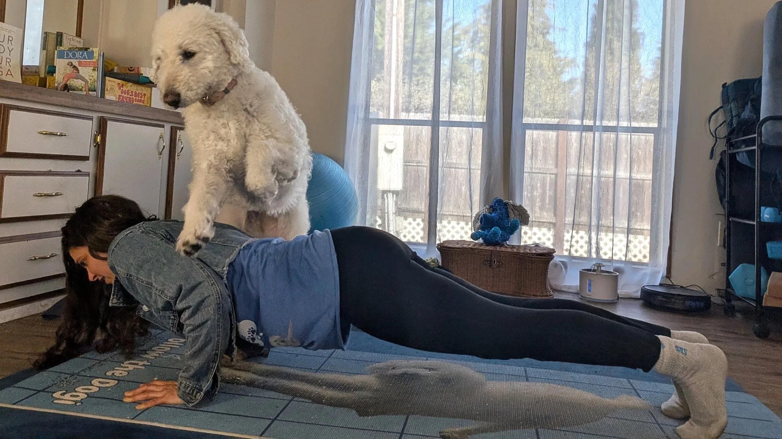I dream of moving from plank to chaturanga while my dog, Waffles balances on my back.