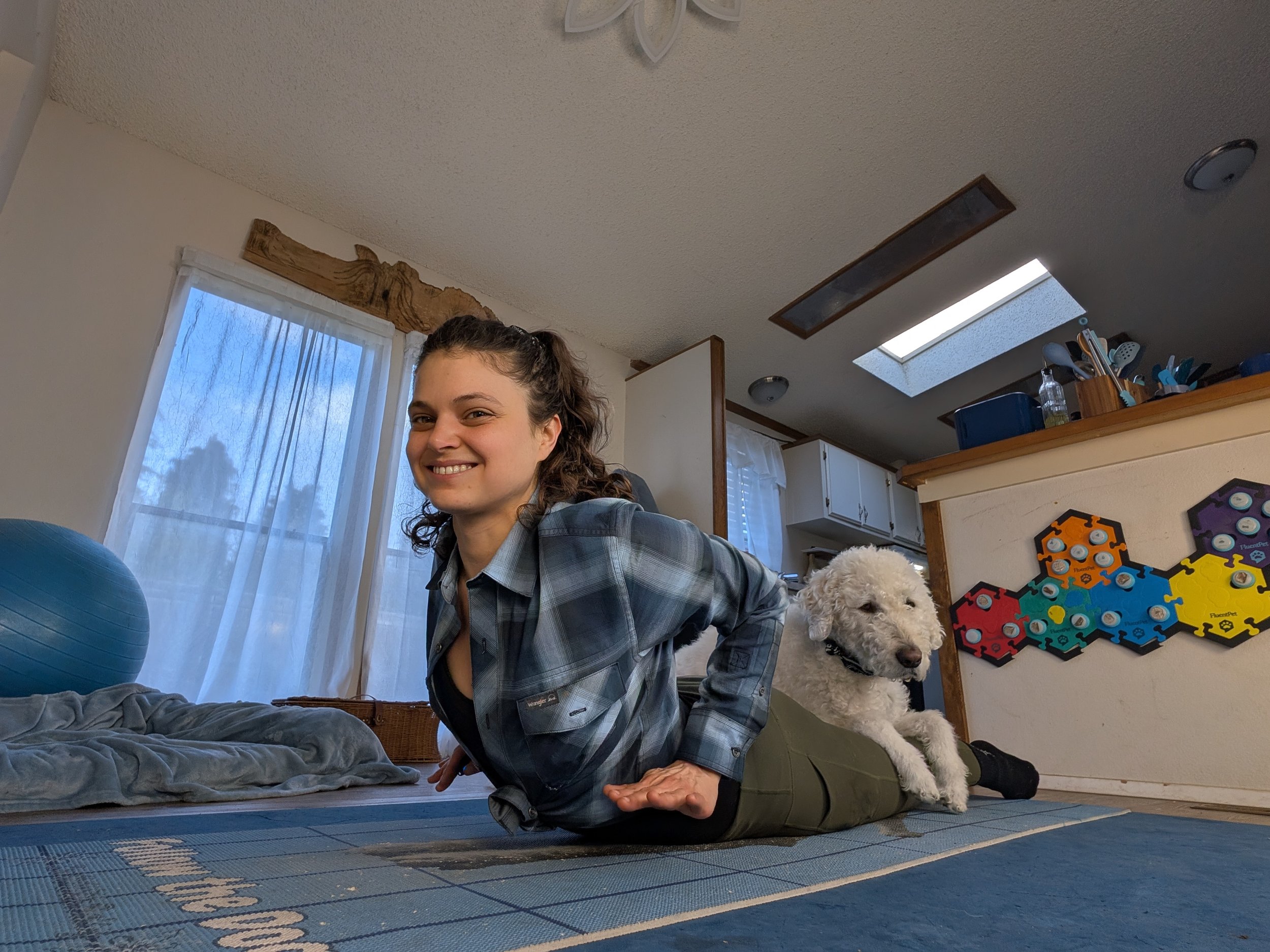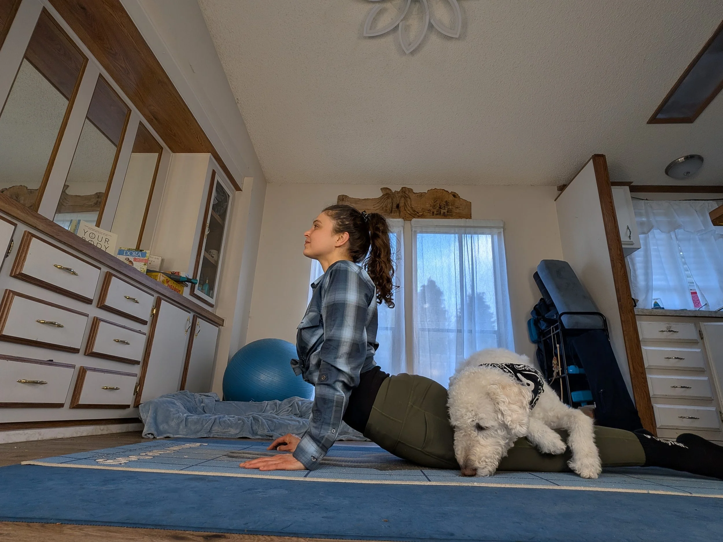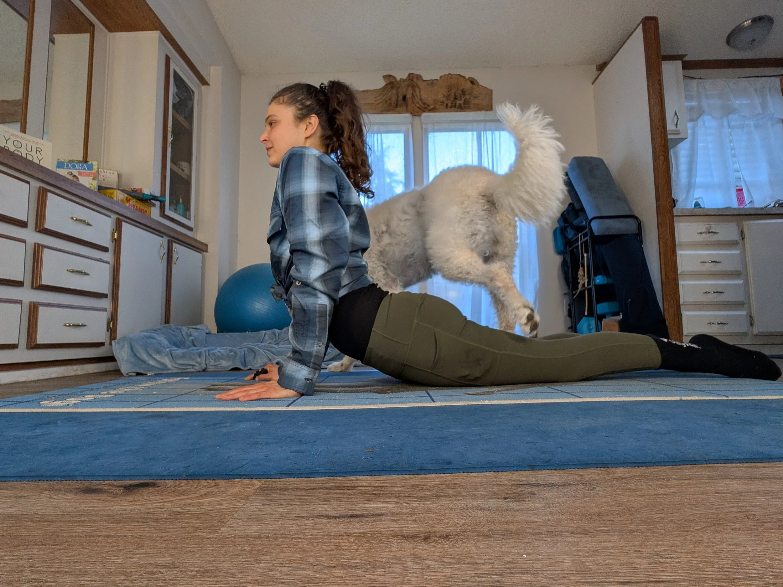 Allow free interaction, Waffles walking around me as I practice King Cobra Posture